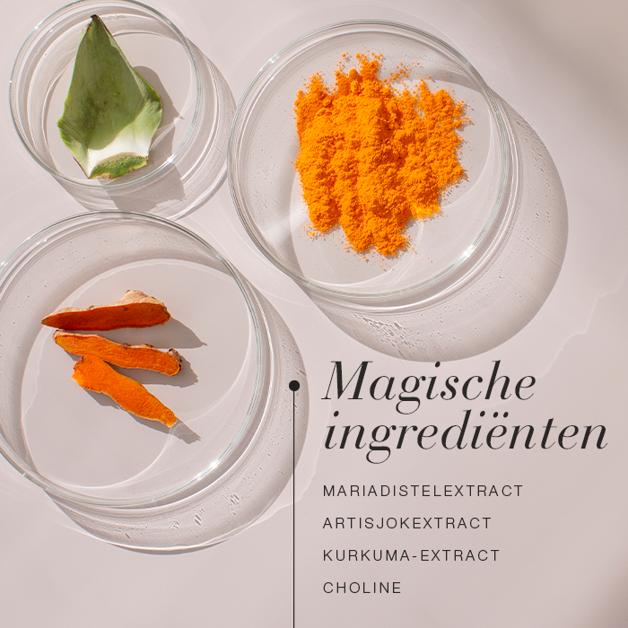 De formule bevat mariadistel, een ingrediënt dat al eeuwenlang wordt gebruikt en bekend staat om zijn leverondersteunende eigenschappen. Artisjok draagt bij aan de normale leverfunctie en speelt een rol in de vetstofwisseling, terwijl kurkuma de blend aanvult met een traditioneel gebruikt kruid.