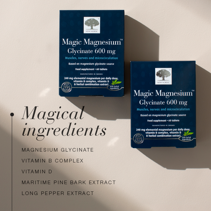 Magnesium glycinate is a mineral formed from elemental magnesium and the amino acid glycine, which assists in more than 300 metabolic reactions—from supporting nerve function to regulating muscle function to maintaining bone density. Magnesium glycinate can be naturally found in legumes, nuts, seeds, and yoghurt. New Nordic’s Magic Magnesium™ Glycinate provides 240mg of elemental magnesium per serving, as well as a high vitamin D and B vitamin dosage, plus French maritime pine bark.