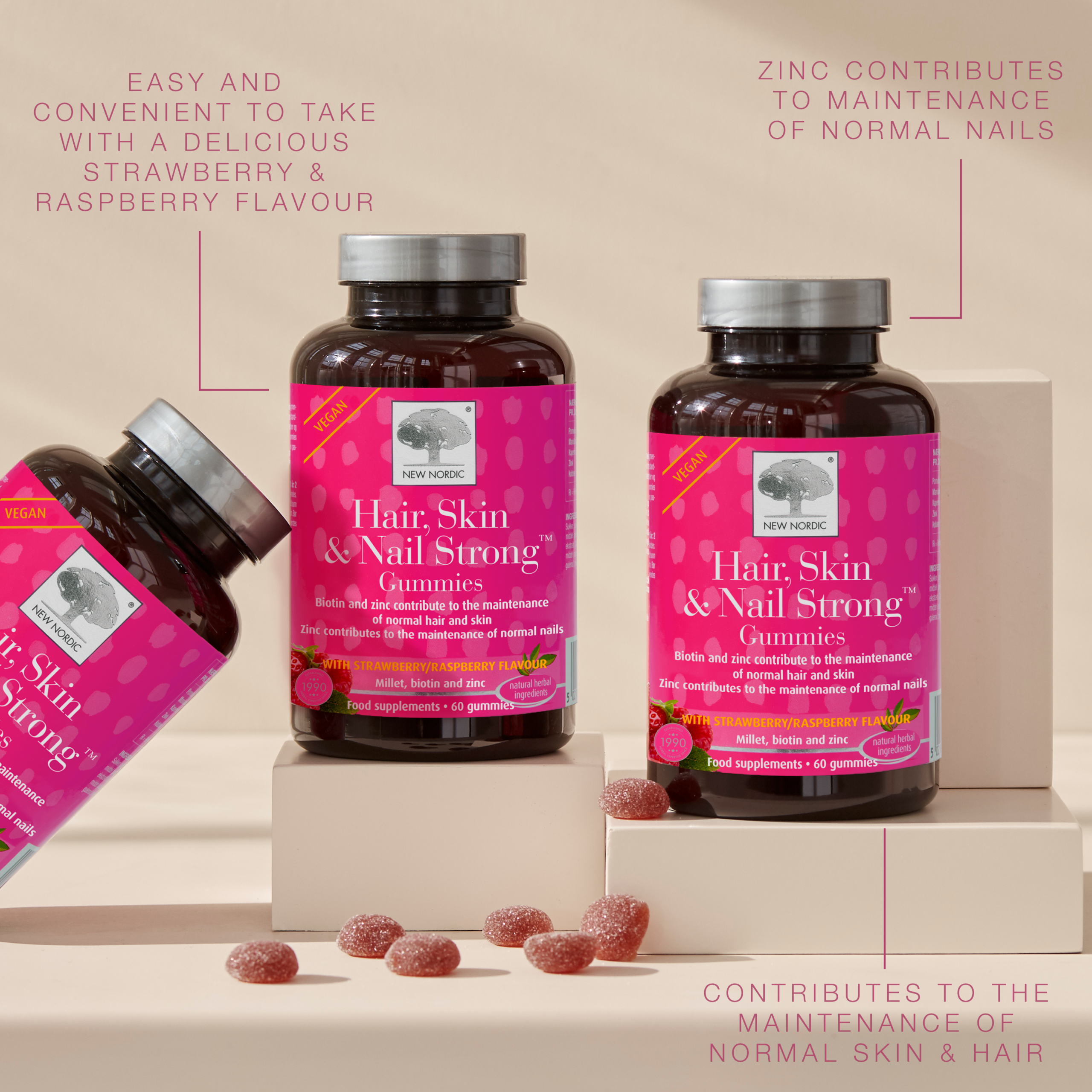 Hair, Skin & Nail Strong™ Gummies are tasty strawberry–raspberry gummies formulated with biotin, millet and zinc. Each gummy provides a simple daily way to help maintain the normal function of skin, hair and nails. Biotin and zinc contribute to the maintenance of normal skin and hair, while zinc also contributes to the maintenance of normal nails—making these gummies an easy and enjoyable alternative to tablets.