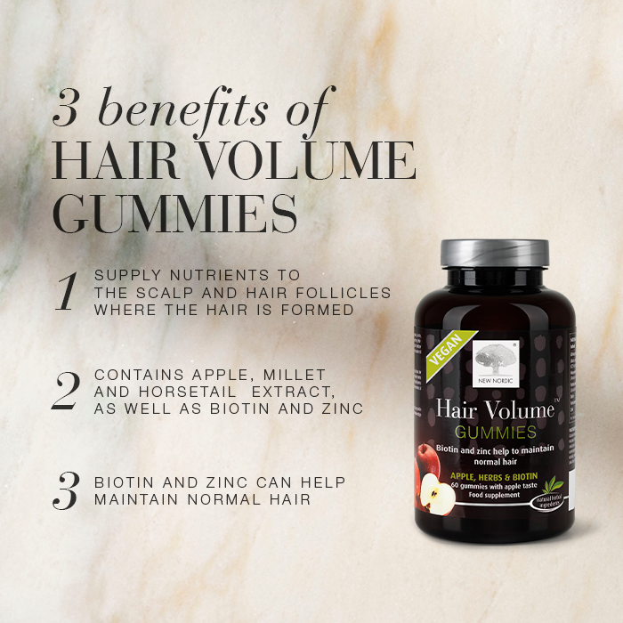 We have evolved our increasingly popular hair volumising range to include our easy-to-take daily hair gummies. Vegan, dairy-free and gluten-free, our Hair Volumeā„¢ Gummies have been a glowing success with our New Nordic community. With a sweet apple flavour, these gummies supply key nutrients to your scalp and hair follicles, which support healthy and normal hair growth. Adore your hair once more with our Hair Volumeā„¢ Gummies.