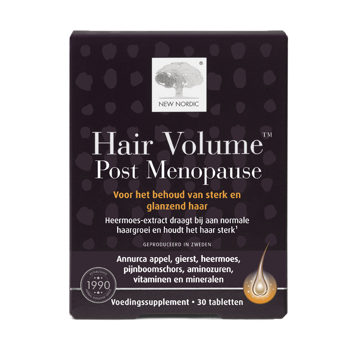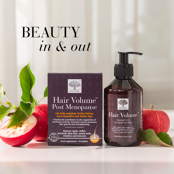 To help improve the appearance of our hair after menopause, New Nordic have developed a daily Hair Volumeā„¢ Post Menopause tablet. Taken once a day as part of your routine, you will start to notice a visible difference and new confidence in your hair texture, thickness and strength.