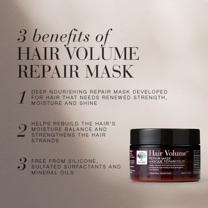 Hair Volumeā„¢ Repair Mask is part of New Nordic’s Hair Volumeā„¢ range – a complete haircare concept designed to care for hair both externally and from within. The range combines topical haircare with carefully formulated supplements, created to complement each other and help maintain strong, healthy-looking hair with natural volume.
