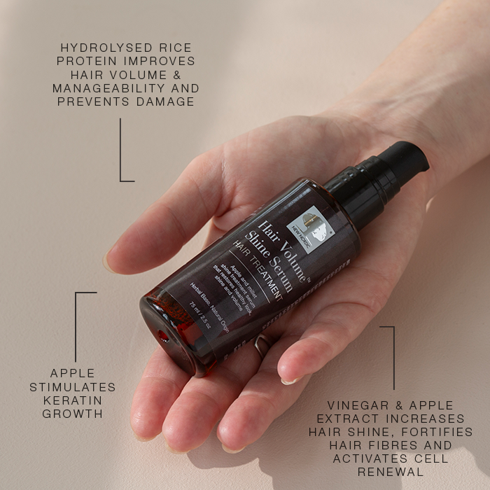 The formula combines botanical extracts and proteins that help care for the hair from root to tip. Apple fruit water and apple extract help enhance shine and vitality, while vinegar contributes to smoother hair fibres and a glossy finish. Hydrolysed rice protein helps improve volume and manageability, and millet extract nourishes the hair for a fuller-looking result. Together, these ingredients help leave the hair looking shinier, stronger and more resilient.