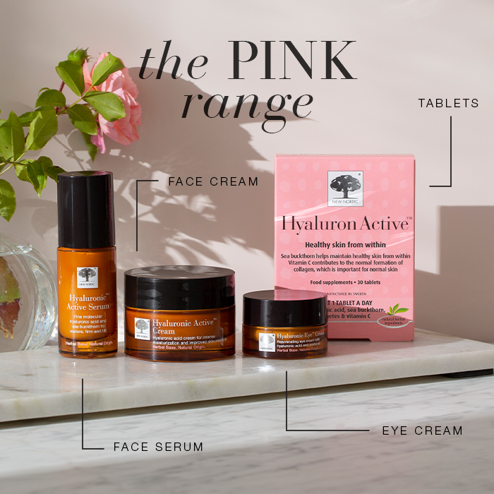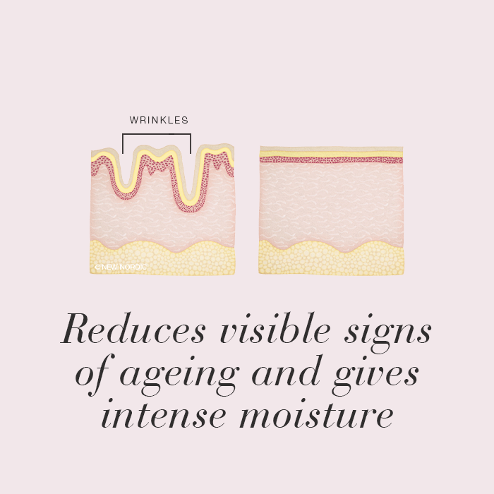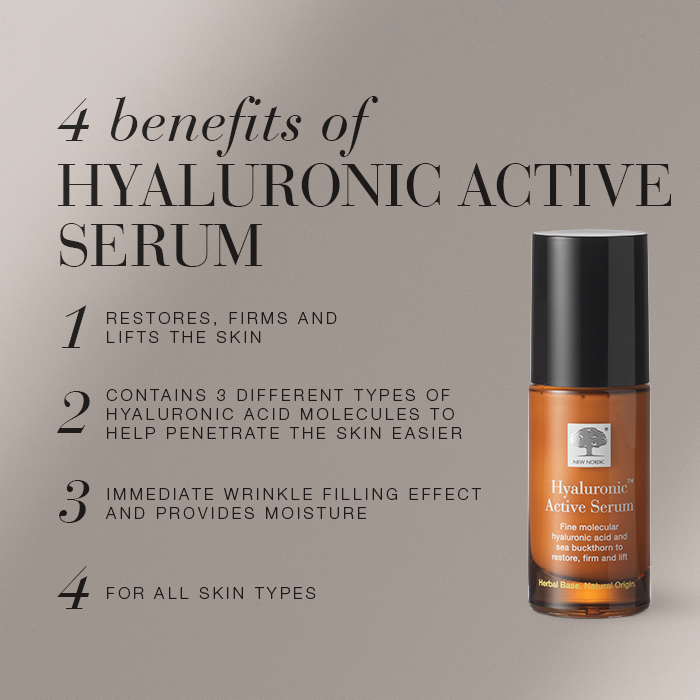 New Nordic Hyaluronic Active™ Serum, moisturises, soothes, and lifts for younger-looking skin with hyaluronic acid, sea buckthorn, and squalene.