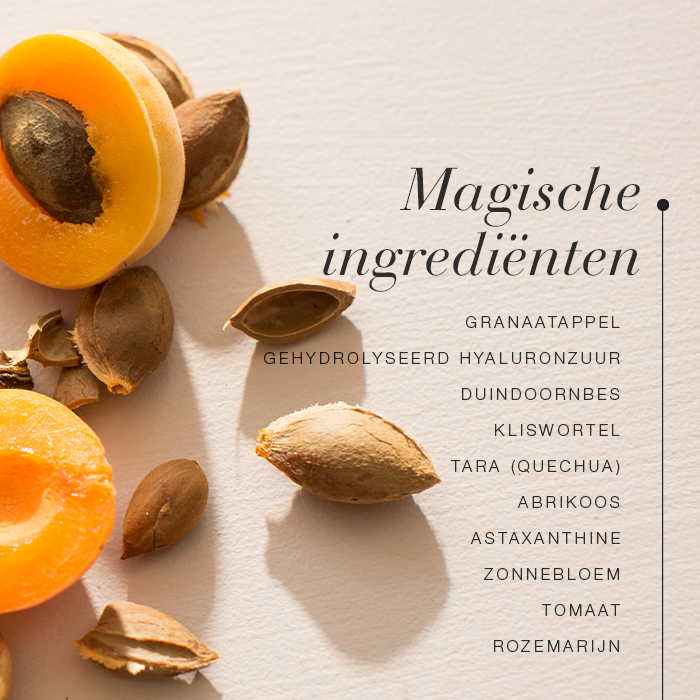 • HYALURONZUUR | Helpt de huid vocht vasthouden, verstevigt de huid en maakt haar elastischer.