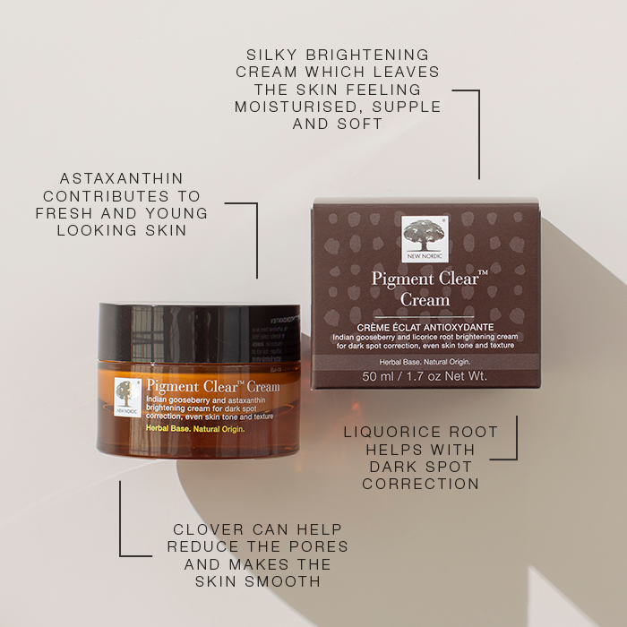 Discover skincare that works with your skin — not against it. Pigment Clear™ Cream from New Nordic® is developed to help reduce the visibility of dark spots and uneven tone, revealing a fresher, more uniform and radiant appearance. The lightweight, silky formula absorbs quickly, leaving the skin hydrated, soft and calm — ideal for daily use as part of your S-Beauty routine, where simplicity and efficacy go hand in hand.