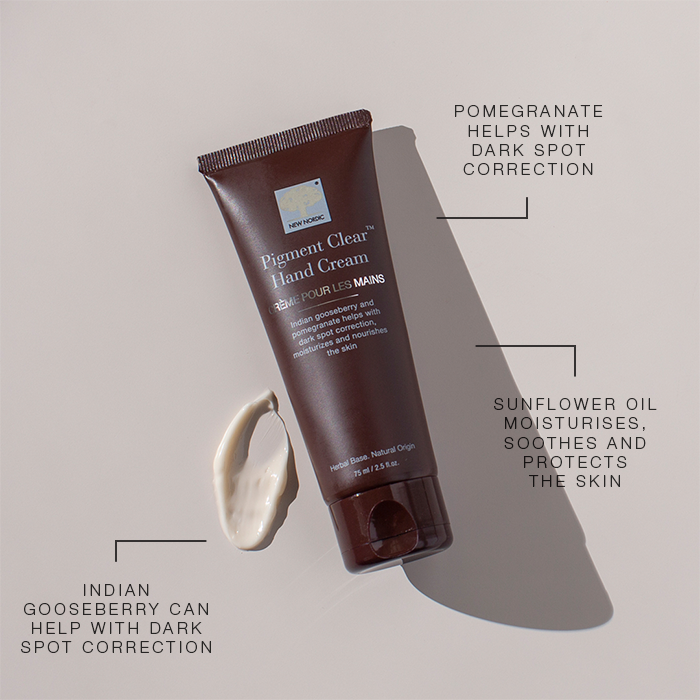 New Nordic Pigment Clear™ Hand Cream, brightens and evens skin tone with sunflower oil, Indian gooseberry, mulberry, and astaxanthin.